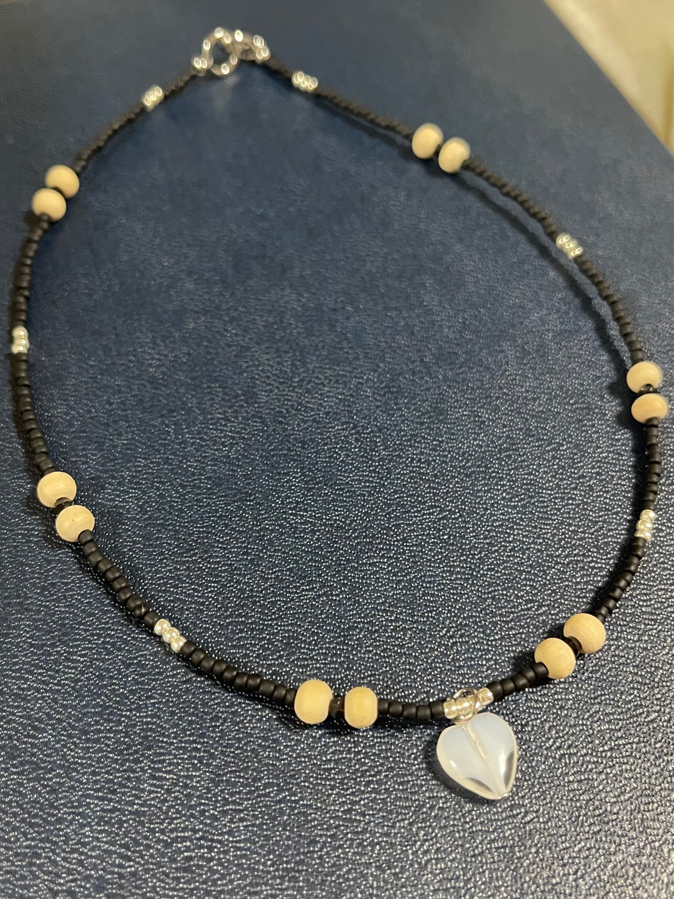 ウッドビーズをアクセントにして、黒をベースに全体はシンプルにまとめておりますので、重ね付けにもおすすめです